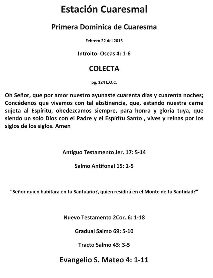 Primera Dominica de Cuaresma: Febrero 22 del 2105