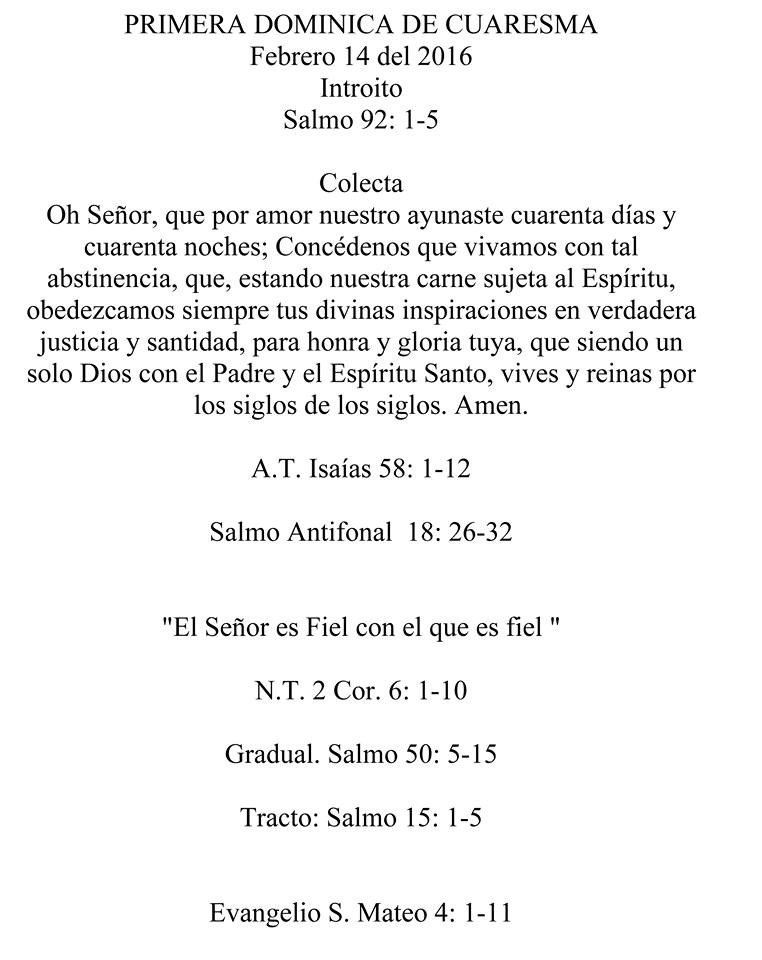 Priemera Dominica De Cuaresma, Lecturas Liturgicas Para La Misa: Febrero 14 Del 2016 . Se Conmemora El Ayuno Del Desierto