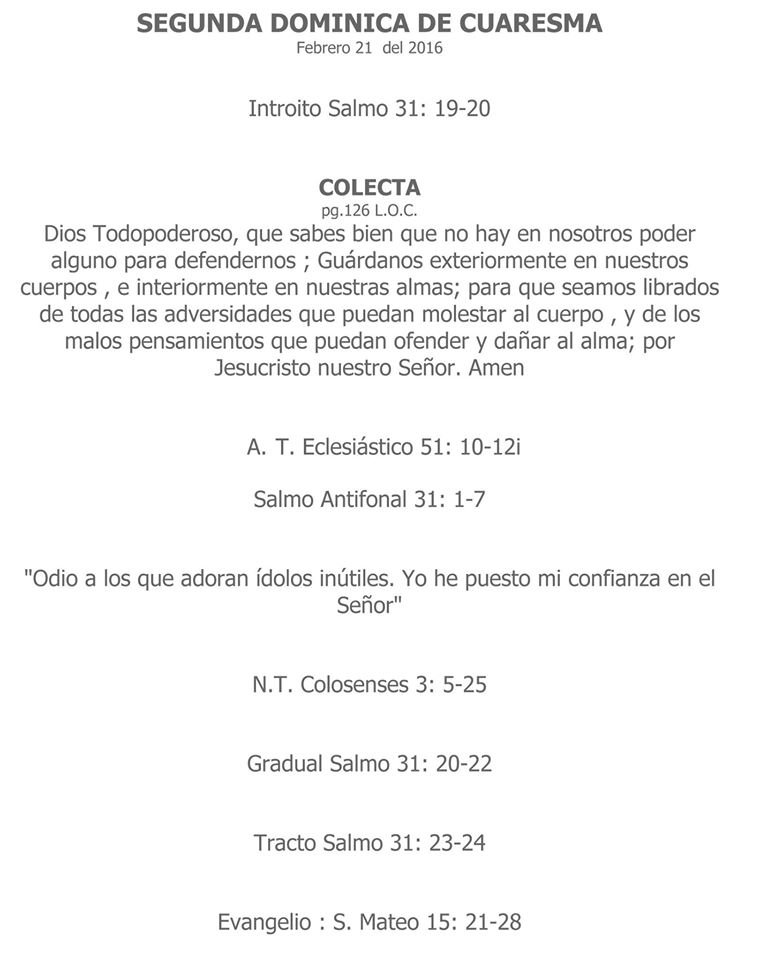 Lecturas Liturgicas Para La Misa Segunda Dominica De Cuaresma: Febrero 21 Del 2916