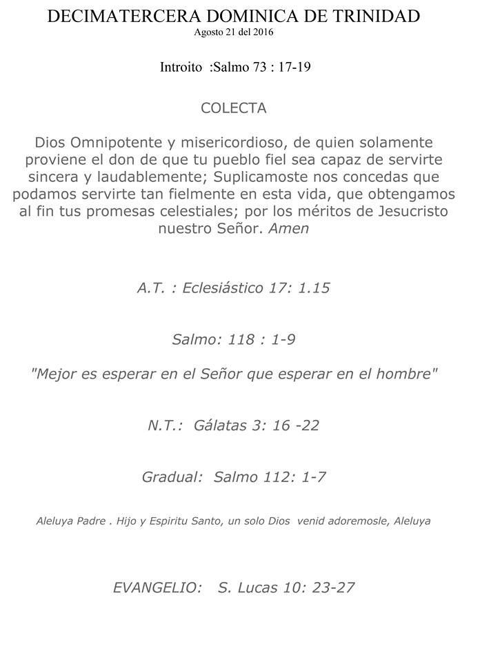 Lectura De La Misa Para El Domingi De La Decimatercera Dominca De Trinidad, Agosto 21 De 2016