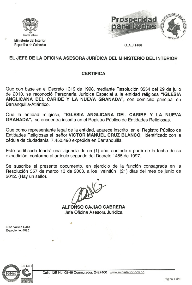 El Ministerio Del Interior De La República De Colombia Renueva La Representación Legal De La Iglesia Anglicana Del Caribe Y La Nueva Granada Y Establece La Validez De La Certificación Legal Durante El Próximo Año 2013 Renovando El Registro Público Del Arzobispo Ordinario ++Victor Manuel Cruz Blanco, Quien Preside La Iglesia En La Provincia Católica De Rito Anglicano En El Caribe Y La Nueva Granada. 2012-06-21