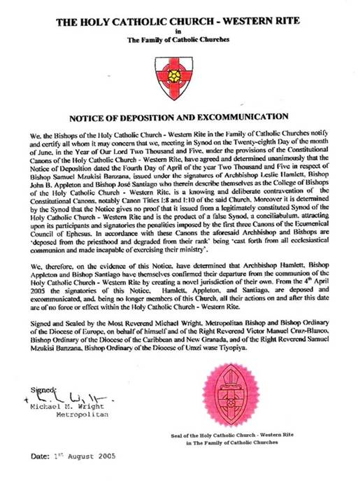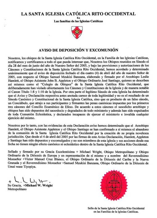 El Excomulgado Y Depuesto Leslie HamlettEn Junio Del 2005 Con La Directa Dirección Y Presidencia De Su Gracia ++Michael M. Wrigth, del Sinodo De Nuestra Provincia De La Holy Catolic Church-Western Rite, Celebrado En La Abadia De Getsemaní En Rionegro, Santander, Colombia, Se Decretó La Excomunión Y Deposición De Los Obispos Leslie Hamlett, Appleton Y José Santiago, Quedando Fuera De La Iglesia, Al Inventarse Una Novelesca Jurisdicción De Rito Occidental, Y Cometer Graves Crimenes Canónicos, Al Romper La Unidad Y La Colegialidad, Al Introducir Costumbres Y Disciplinas No Católicas Y Opuestas A La Tradición Anglicana. Se Invalidó Por Esta Excomunión Y Deposición Todas Las Acciones A Nombre De La Iglesia Cometidos Por Estos Disidentes Y Apóstatas.