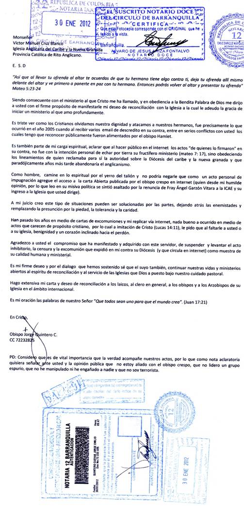 Monseñor Jorge Quintero Cuevas Envió A La Sede Provincial Una Dramática Carta De Reconciliación Y Solicitud De Perdón Explicando En Detalle La Situación De La Iglesia Desde El Año 2005 Cuando El Cismático Y Apóstata Leslie Hamlett, Abandonó A La Iglesia Anglicana Para Inciar Una Secta En Europa, Y Empujo Al Revdo. Jorge Emilio Quintero Al Cisma Y La Rebelión, Y Llevándolo A Desencadenar Una Campaña De Descrédito En Colombia Por Via De Internet Contra El Arzobispo Ordinaro, Su Gracia Victor Manuel Cruz Blanco.