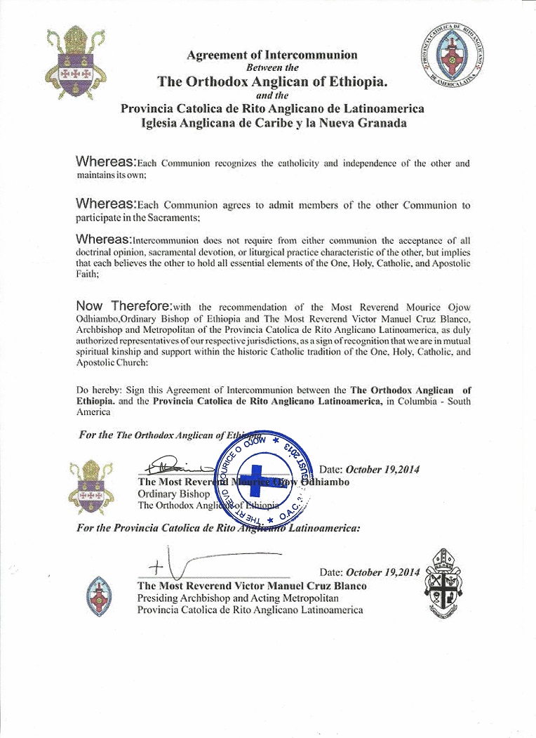 El 19 De Octubre En La Decimaoctava Dominica De Trinidad Fue Solemnizada El Concordato De Plena Comunión Con La Iglesia Anglicana Ortodoxa De Ethiopia Con Su Obispo Bishop Mourice Ojow. Este Acuerdo Ecuménico Es El Resultado De Un Desarrollo Del Crecimiento Y Madurez Del Espectro De La Unidad En Lo Esencial, Según El Ethos Anglicano De La Provincia Católica De Rito Anglicano De América Latina.